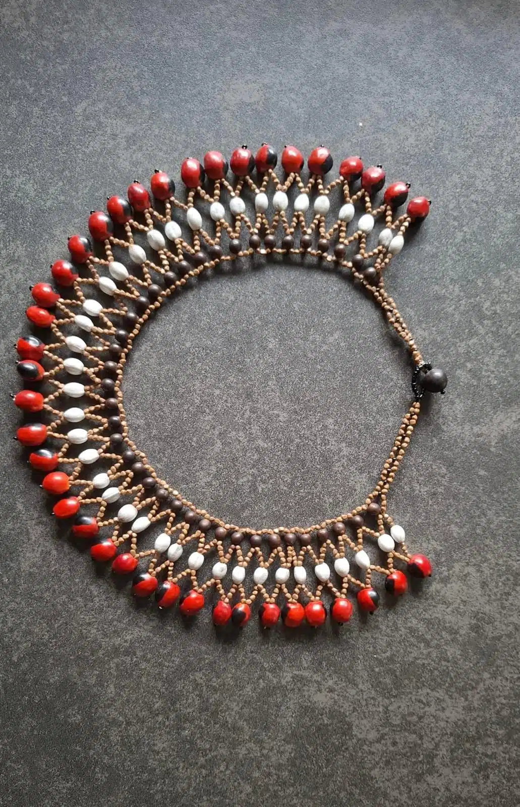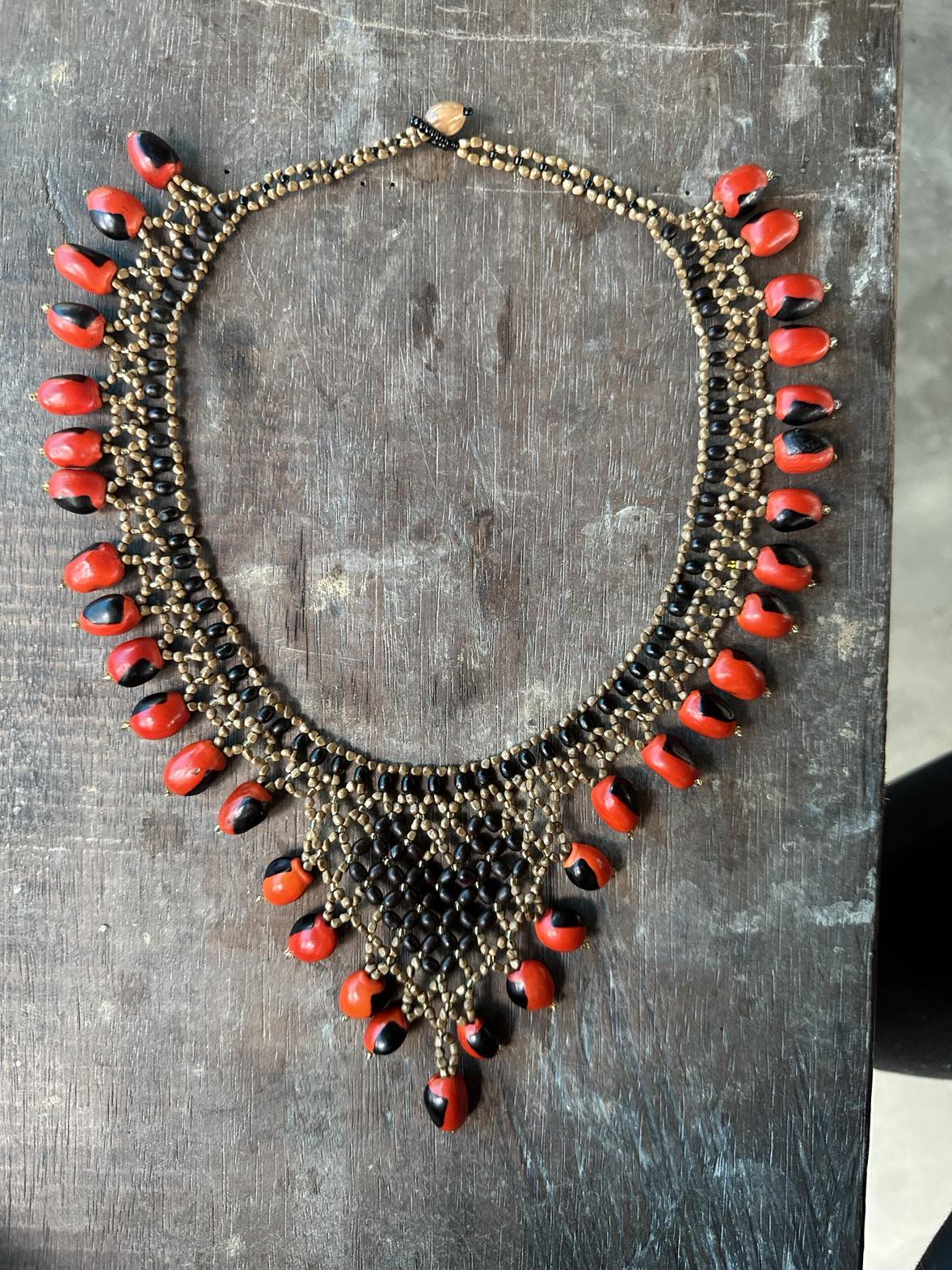 Authentic awajún necklace made from seeds found in amazonian rainforest.